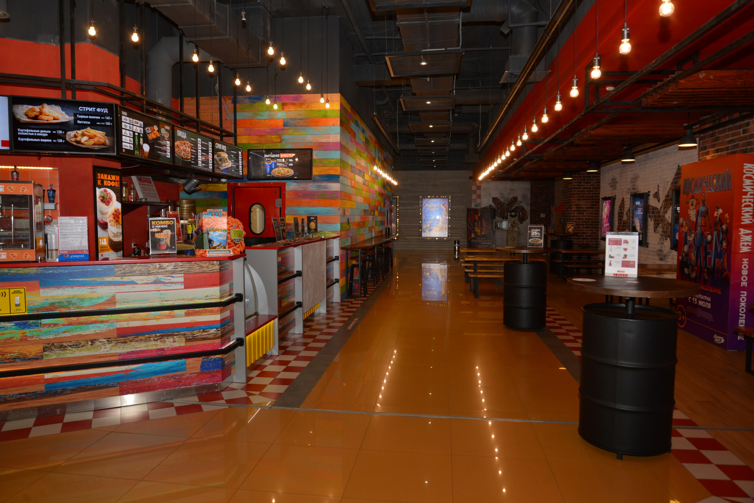 Яркий дизайн создаёт приятную обстановку и отличное настроение. Просторное фойе со стильными столиками в зоне Street Food Bar и уютные диванчики помогут приятно провести время во время ожидания сеанса. Экраны в фойе ненавязчиво транслируют актуальное расписание и информацию о привлекательных акциях.